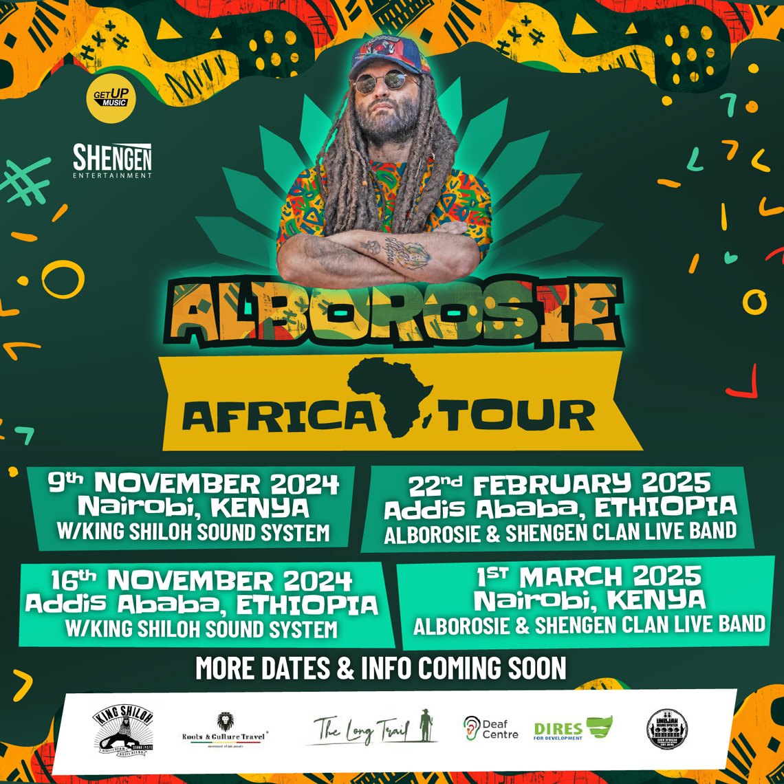 Alborosie is set to start his fist-ever African tour from 9 to 17 November 2024. During this time, he will visit Kenya and Ethiopia to explore their rich cultures, engage with local communities, and to perform at exclusive Reggae Dub Sound System sessions alongside King Shiloh Sound System in Nairobi and Addis Ababa. This trip serves as a precursor to a full live tour scheduled for February and March 2025, when Alborosie will return to Ethiopia and Kenya with his band The Shengen Clan. Confirmed dates include Addis Ababa (Ethiopia) on 22 February, and Nairobi (Kenya) on 15 February, with more dates and countries to be added soon.