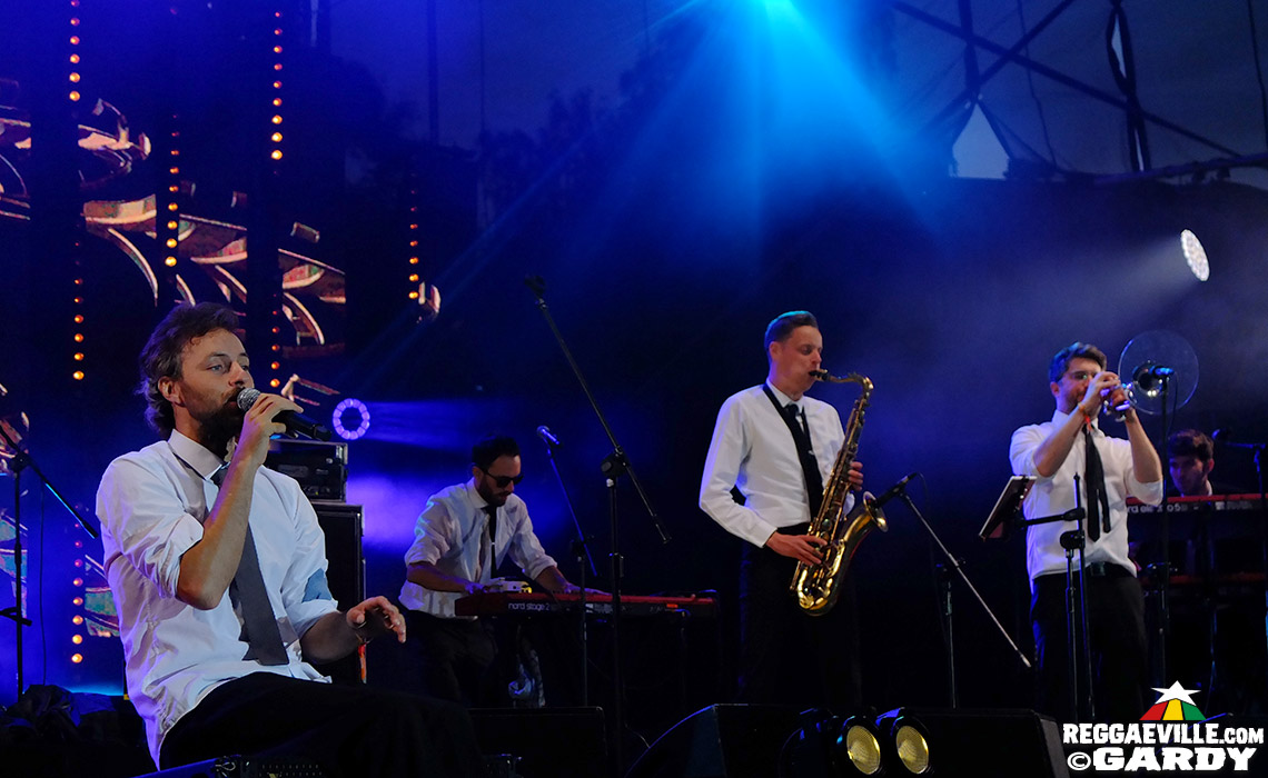 With the settling dusk, the next band has the priviledge to appear in a perfectly orchestrated light- and video-show: welcome on stage, Gentleman's Dub Club! The Leeds band of 9 around frontman Jonathan Scratchley are clearly excited to be here, and in his infectious, congenial attitude, the singer wins over the crowd within the blink of an eye. "It feels so good to come back after 6 years and still feel the love and passion Poland has for Reggae music!" he says, beaming, "Thank you for being here, thank you for the warm welcome, Ostróda!". Taking off jacket, tie and shoes, he continues with an ardent delivery of tracks like Stardust (from their most recent album Lost In Space) or Highgrade, which melts into an extended live dub, the beauty of which fits that of this splendidly illuminated summer night.